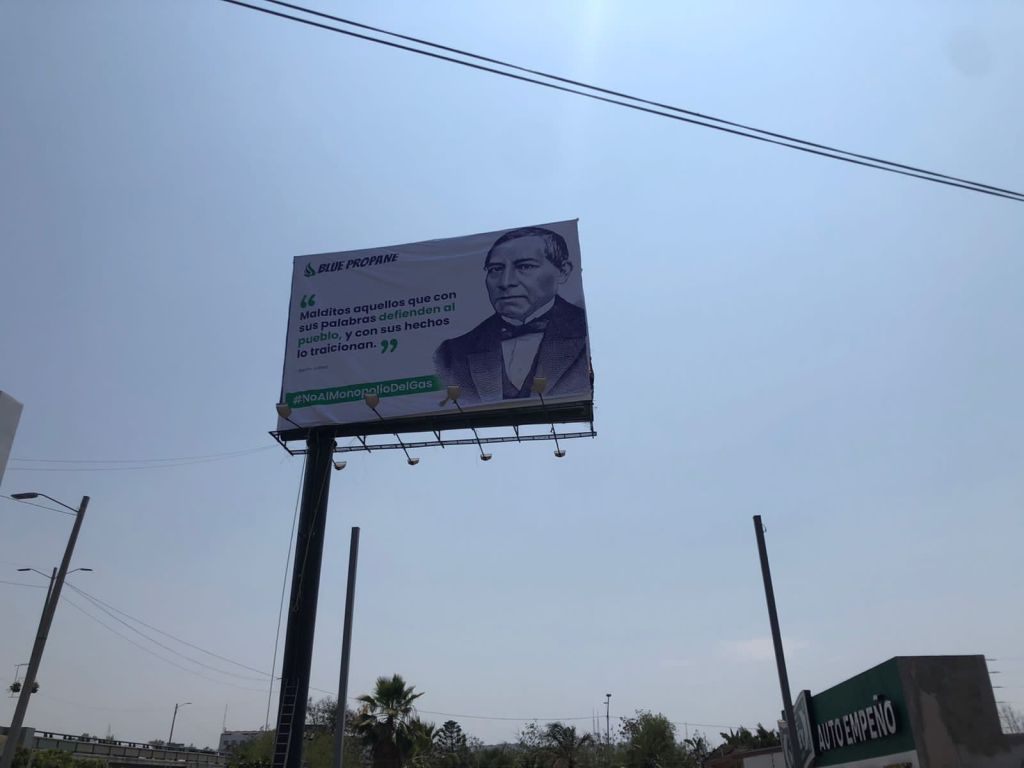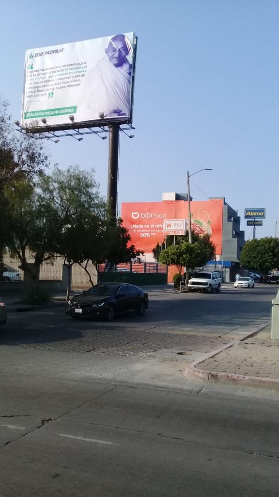 El martes contratamos un espectacular que estaba sobre puente del Blvd Bellas Artes a unos metros de la Garita de Otay. El mensaje contenía una frase de Benito Juárez y otra de Mahatma Gandhi, y el hashtag #NoAlMonopolioDelGas. La Dirección que decía: “Malditos aquellos que con sus palabras defienden al pueblo y con sus hechos lo traicionan”, y otra de Mahatma Gandhi “Cuando me desespero, recuerdo que a través de la historia, los caminos de la verdad y del amor siempre han triunfado. Ha habido tiranos, asesinos, y por un tiempo pueden parecer invencibles, pero al final, siempre caen. Siempre».