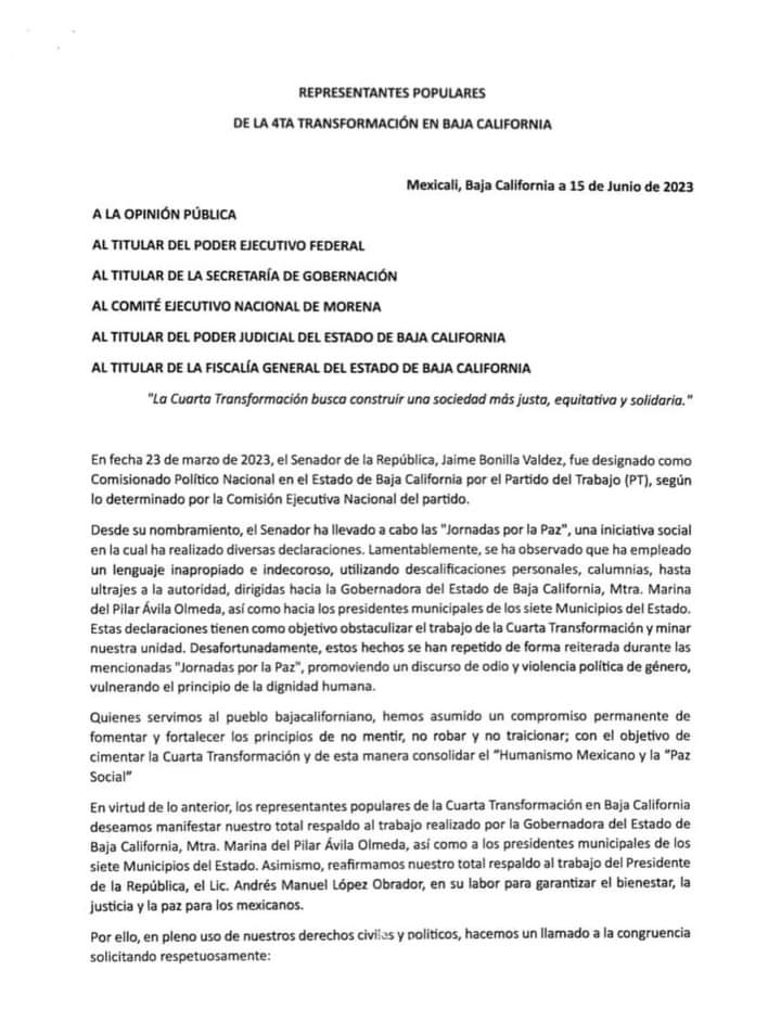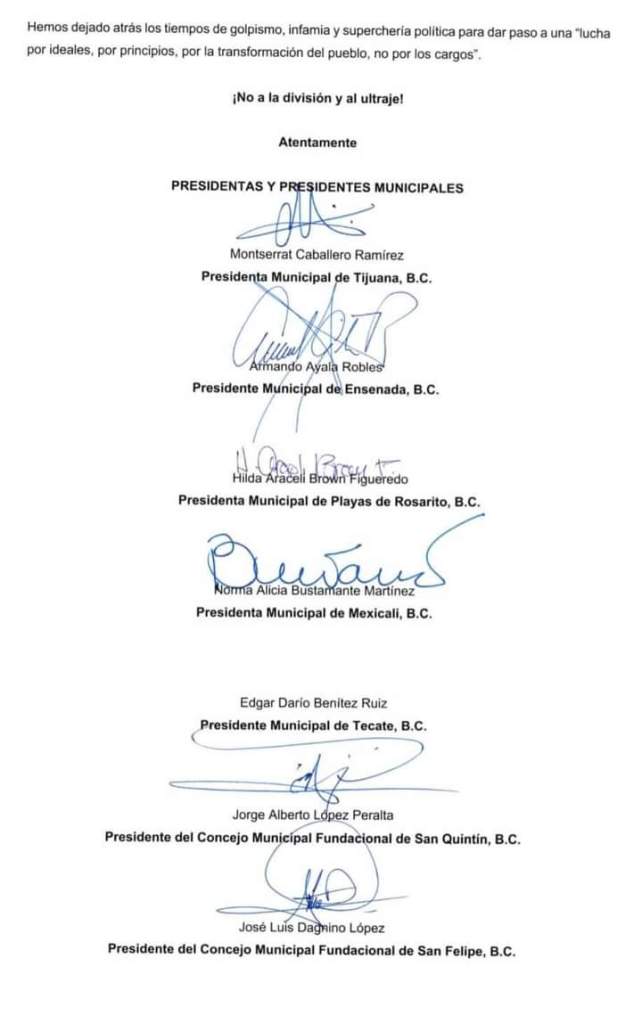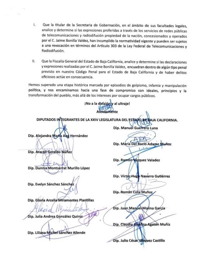 En un documento firmado por Diputados y Alcaldes de B.C. dónde la primera en firmar es la Alcaldesa de Tijuana, le solicitan al presidente de México que le retire las conseciones en el uso del espectro radiofónico de las estaciones de radio y televisión propiedad del Senador Jaime Bonilla, por hacer señalamientos a la Gobernadora y Alcaldes de BC, particularmente la de Tijuana.