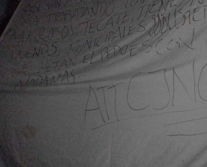 «Ahy está tu gente moustro o el 7 y tu lambe huevos del chicho, así ban a kedar todo akel k siga trabajando con estos mugrosos, tecate ya tiene nuevos dueños, municipales ustedes no se metan el pedo es con ellos nadamás, att. CJNG«