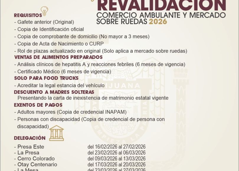 Tijuana, Baja California, a 15 de febrero de 2026. Con el objetivo de mantener el orden en el comercio de la ciudad, el gobierno del presidente municipal, Ismael Burgueño Ruiz, a través de la Dirección de Inspección y Verificación, iniciará este lunes 16 de febrero con el programa de Revalidación de Permisos para Comercio Ambulante y Mercados Sobre Ruedas 2026.